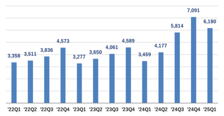 様々な統計をもとに、独自の方法を用いてコメの市場規模を算出したところ、2兆2,640億円(2024年)となりました。この数値は出荷額ベースではなく消費者購入ベースです。また外食と中食は含みません。また、1家計あたりのコメの支出額について四半期毎の推移をまとめたものが以下のグラフです。2022年Q1(1月~3月)は3ヶ月で3,358円だったものが、2025年Q1(1月~3月)は6,180円と2倍弱になっています。急にコメの消費量が増えたわけではないので、確かにコメの価格が上昇していることが、この数値から見て取れます。