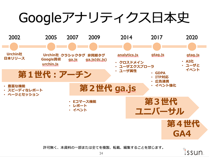 正式な略称は「GA4」ジーエーフォーとなるようです。なぜ「4」なのか?本来であれば「何ができるのか?」を語るべき筆者の立場ですが「やっぱり時事ネタはウンチクから」そんなナイスミドル読者からのリクエストにお応えして、今回も飲み会で受けるほうのネタをお伝えしたいと思います。ネタの入りとしてはこうです。「第4世代のGoogleアナリティクスって知ってる?」はい、ドン引きされてもそのまま突っ走りましょう。お笑いでも「第七世代」とかありますよね。あれは、第1世代が林家三平、牧伸二、コント55号といった白黒テレビが登場して寄席や演芸の舞台が放送された時代です。で、第2世代がドリフターズや欽ちゃんに始まり、オレたちひょうきん族まで、テレビのためにお笑いの形態が進化した時代なんです。そして第3世代が師匠と弟子の関係を持たないダウンタウン・ウッチャンナンチャンの時代。本当はここで業界的な世代の区切りは終わっていたのですが、霜降り明星たちが登場して「今までと様子とセンスが違うぞ」ということで彼らを「だいたい第7世代くらい」と定義したらしいです。へぇ〜となったところで、グーグルアナリティクスです。GA4(ジーエーフォー)とは、アーチン時代から脈々と受け継がれるグーグル・アナリティクスの第4世代なのです。まずはこちらの年表をご覧下さい。