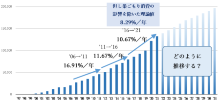 5年間隔でのCAGR(年平均成長率)を計算したところ、2006年→2011年は16.91%/年、2011年→2016年は11.67%/年、2016年→2021年は10.67%/年という値になります。しかしながら既知の通り2020年はコロナ禍においてEC業界には巣ごもり消費という追い風が吹きました。そこで2019年→2020年の伸長率を前年と同等との仮定を置き計算しなおしてみたところ、2020年には1兆3,676億円の押し上げ効果があったと推定されます。この押し上げ効果を取り除いてあらためて2016年→2021年のCAGRを計算してみたところ8.29%/年という理論値になりました。つまり2006年から2021年までのCAGRを5年刻みで捉えれば16.91%、11.67%、8.29%と着実に下降線を辿っていることがわかります。ただし誤解を与えないように申し上げると、下降線を辿っているとはいえ四半世紀が経過してもなおこの成長率は驚きであり、まだ伸び代を残している点は特筆すべきでしょう。